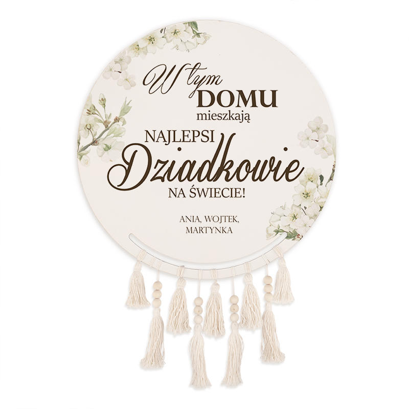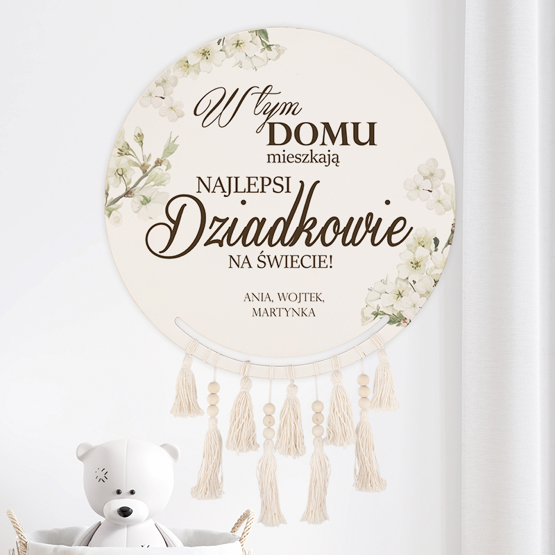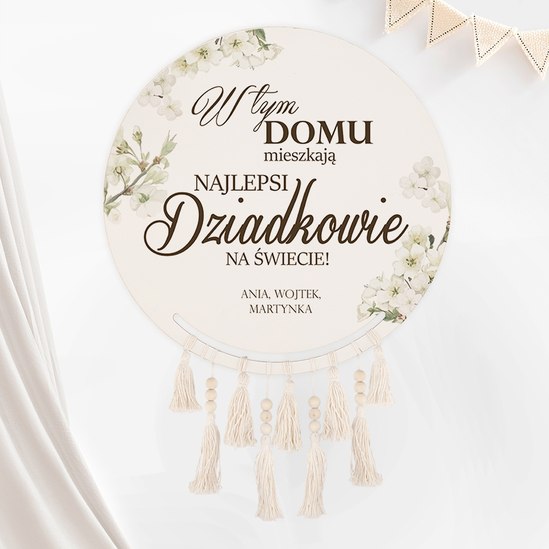 Okrągła tablica dekoracyjna z napisem: 'W tym DOMU mieszkają NAJLEPSI Dziadkowie NA ŚWIECIE!' Pod napisem znajdują się imiona: Ania, Wojtek, Martynka. Tablica ozdobiona jest delikatnymi kwiatami i ma frędzle na dole.