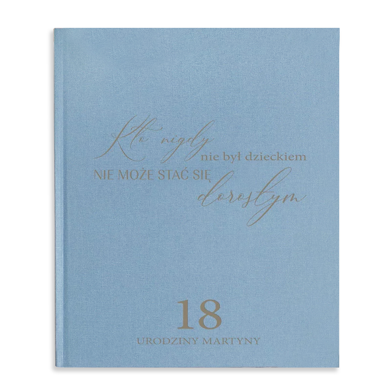 - Album do wklejania zdjęć to znakomity podarunek na 18 urodziny, zwłaszcza gdy na okładce znajduje się piękny i wzruszający napis. Album jest oprawiony płóciennym materiałem na powierzchni sztywnej okładki. Na froncie jej umieścimy grawerowaną dedykację, która idealnie pasuje na okazję, jaką są 18 urodziny: Kto nigdy nie był dzieckiem, nie może stać się dorosłym. Przy dolnej krawędzi okładki znajdzie się również personalizowany dopisek z imieniem. Napis wykonamy metodą grawerowania, dzięki czemu będzie on wyglądał kunsztownie i bardzo elegancko. Grawer to trwała technika, dzięki czemu umieszczony napis przez długie lata zachowa swój dekoracyjny wygląd.