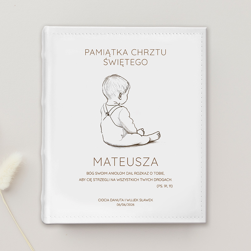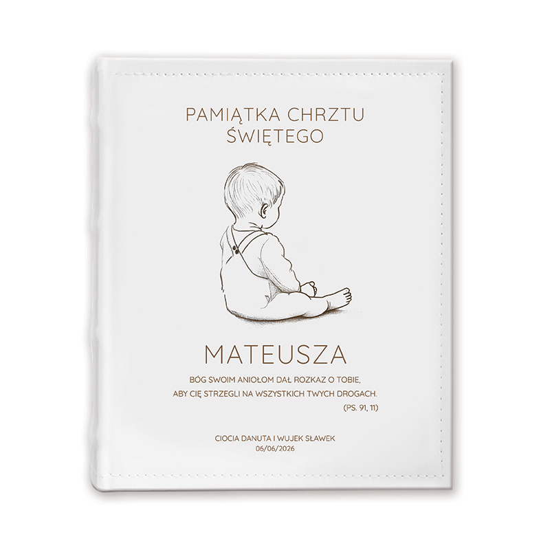 Pamiątkowy album to starannie wykonany prezent, który zachwyca zarówno wyglądem, jak i trwałością. Personalizowana okładka jest w jasnej kolorystyce. Na niej znajduje się subtelna grafika chłopca oraz imię dziecka, a także możliwość umieszczenia dedykacji i daty uroczystości. Na okładce umieszczony jest napis “Pamiątka Chrztu Świętego” oraz cytat z Księgi Psalmów, który brzmi “Bóg swoim Aniołom dał rozkaz o Tobie, aby Cię strzegli na wszystkich Twych Drogach. (PS. 91,11)”. Wewnątrz albumu znajduje się przestrzeń na wklejane fotografie, dzięki czemu rodzice mogą uporządkować wszystkie najważniejsze momenty – od uroczystości w kościele po rodzinne przyjęcie.