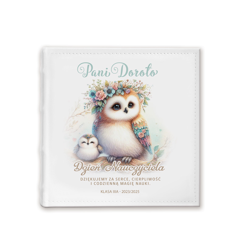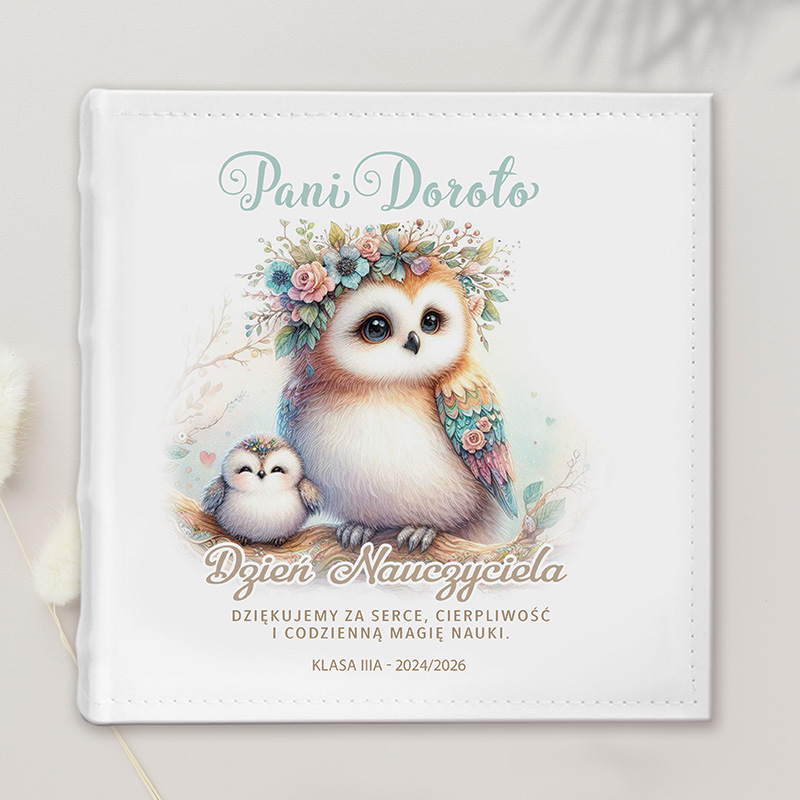 Starannie zaprojektowana okładka, ozdobiona uroczą ilustracją sów – symboli mądrości i opiekuńczości – oraz  personalizacja imieniem nauczyciela i dedykacja sprawiają, że jest to prezent zarówno funkcjonalny, jak i pełen emocji. To piękna pamiątka, która w wyjątkowy sposób wyrazi wdzięczność za serce, cierpliwość i codzienny trud nauczania.