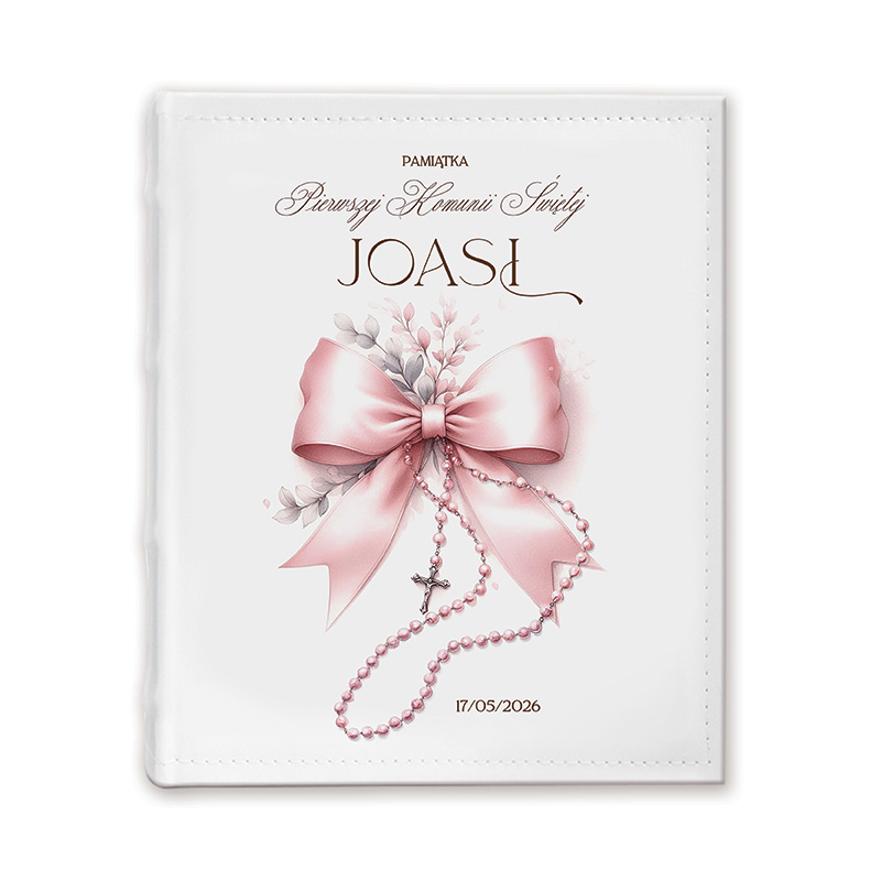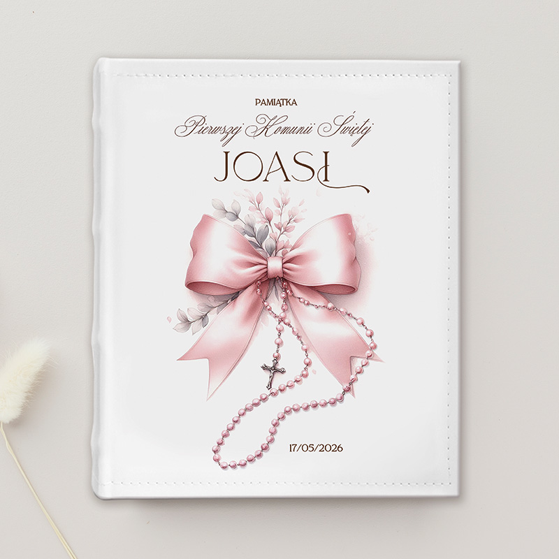 Album komunijny na zdjęcia dla dziewczynki z motywem różowej kokardy to stylowa pamiątka Pierwszej Komunii Świętej, stworzona z myślą o zachowaniu najcenniejszych chwil z tego wyjątkowego dnia. Jasna, delikatna kolorystyka oraz subtelne elementy religijne sprawiają, że album harmonijnie współgra z uroczystym charakterem wydarzenia, a jednocześnie ma lekki, dziewczęcy wygląd.