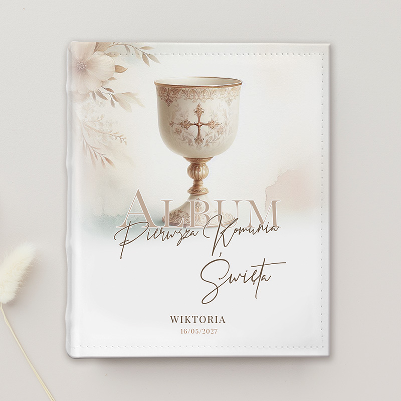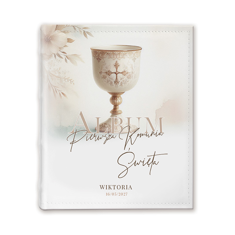 Okładka albumu utrzymana jest w stylu boho. Centralnym elementem grafiki jest kielich – symbol Eucharystii. Całość uzupełniają elegancki napis “Album Pierwszej Komunii Świętej” oraz personalizacja na dole albumu imieniem dziecka oraz datą uroczystości. Album wykonany jest z wysokiej jakości materiałów. Wewnątrz znajduje się grubsze karty, które idealnie nadają się na wklejanie zdjęć z uroczystości i przyjęcia. Każda karta dodatkowo została przedzielona półpergaminem, który chroni zdjęcia przed sklejaniem się oraz zarysowaniami.