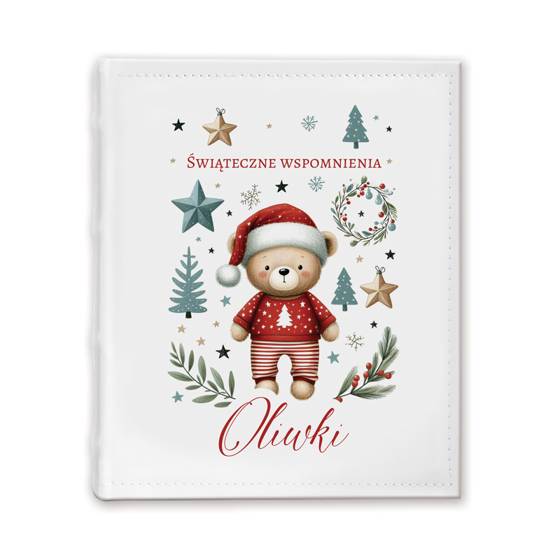 Okładkę zdobi uroczy miś ubrany w świąteczny sweterek i czapkę. Otaczają go choinki, gwiazdki, gałązki oraz inne bożonarodzeniowe symbole. Kolorystyka jest ciepła i stonowana – przeważają zielenie, czerwienie i biel. W centralnej części znajduje się nadruk z imieniem dziecka. Album ma twardą oprawę i zawiera 30 kart.