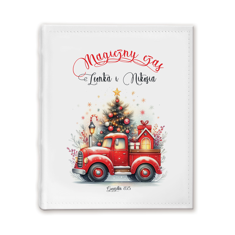 Na okładce znajduje się bajkowa ilustracja – klasyczna czerwona ciężarówka przewożąca prezenty i domek. W tle pojawiają się świąteczne elementy: choinka, lampki, gałązki i gwiazdki. Nadruk imion i daty nadaje osobisty charakter. Całość utrzymana jest w świątecznej, ale spokojnej kolorystyce. Sam album wykonany jest z wysokiej jakości materiałów – posiada twardą oprawę i karty do wklejania zdjęć.