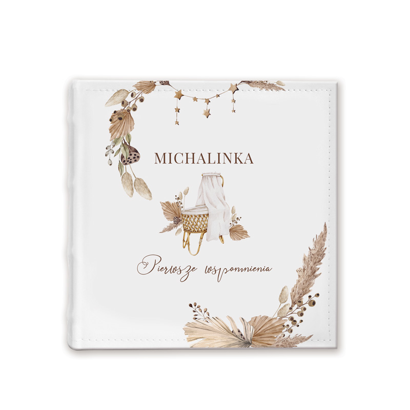 Personalizowany album na zdjęcia wsuwane w stylu boho to piękna i praktyczna pamiątka, stworzona z myślą o przechowywaniu najcenniejszych wspomnień z pierwszych lat życia dziecka. Subtelna, minimalistyczna okładka ozdobiona motywami w odcieniach beżu i złota oraz imieniem malucha nadaje mu wyjątkowego, osobistego charakteru.