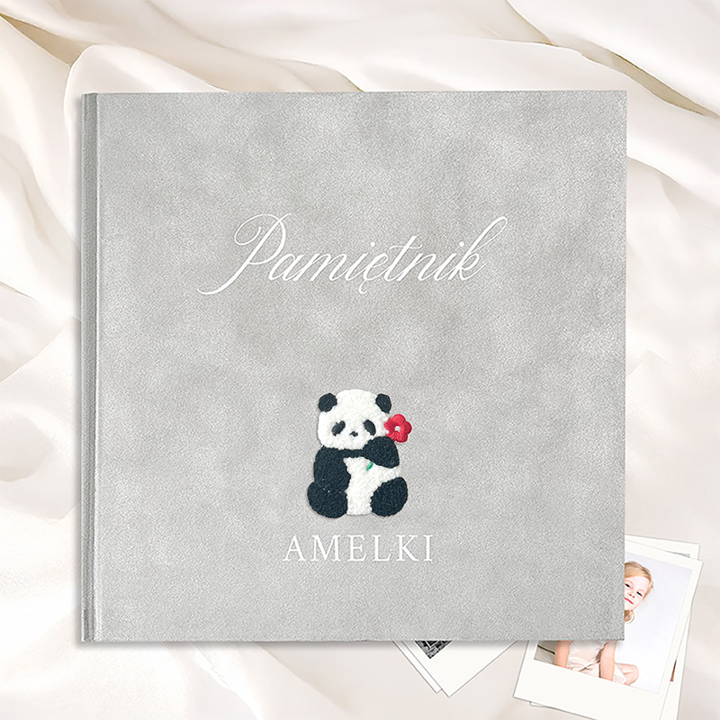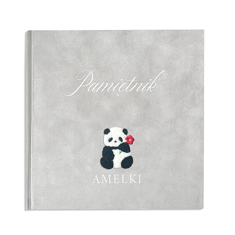 Album wykonany z wysokiej jakości materiałów, które gwarantują trwałość i stylowy wygląd. Jego okładka pokryta jest miękkim welurem, który nadaje mu subtelnej elegancji. Na froncie widnieje ozdobny napis „Pamiętnik” oraz urocza panda. Personalizowany napis na okładce pozwala na umieszczenie imienia dziecka, co sprawia, że album staje się niepowtarzalnym upominkiem. Przykładowa wersja prezentuje napis: „AMELKI”, ale istnieje możliwość dodania dowolnego imienia. Wewnątrz znajdują się grube, solidne karty, które doskonale nadają się do wklejania zdjęć, pisania krótkich wspomnień czy dodawania pamiątkowych notatek. Strony są przystosowane do różnych formatów fotografii, dzięki czemu album można dowolnie aranżować. Mocne szycie i trwała konstrukcja gwarantują, że będzie on cieszyć oko przez wiele lat.