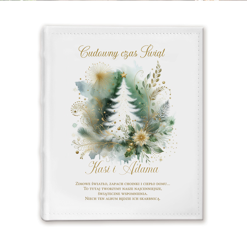 Okładkę wykonano ze skóropodobnego materiału w białym kolorze. Z przodu znajduje się akwarelowy motyw z choinką, złotymi detalami i świątecznym napisem. Personalizacja w postaci imion nadaje całości indywidualny charakter. Album ma wewnątrz strony na które można samodzielnie wklejać zdjęcia. Całość prezentuje się elegancko i estetycznie.