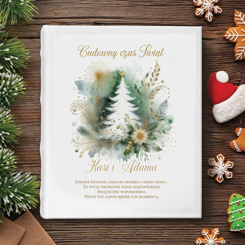 Album ze świątecznym motywem, z ilustracjami choinek, złotymi akcentami oraz tekstem "Cudowny czas Świąt". W tle świąteczne dekoracje, takie jak pierniczki, choinki i ozdoby. Całość na drewnianym stole.