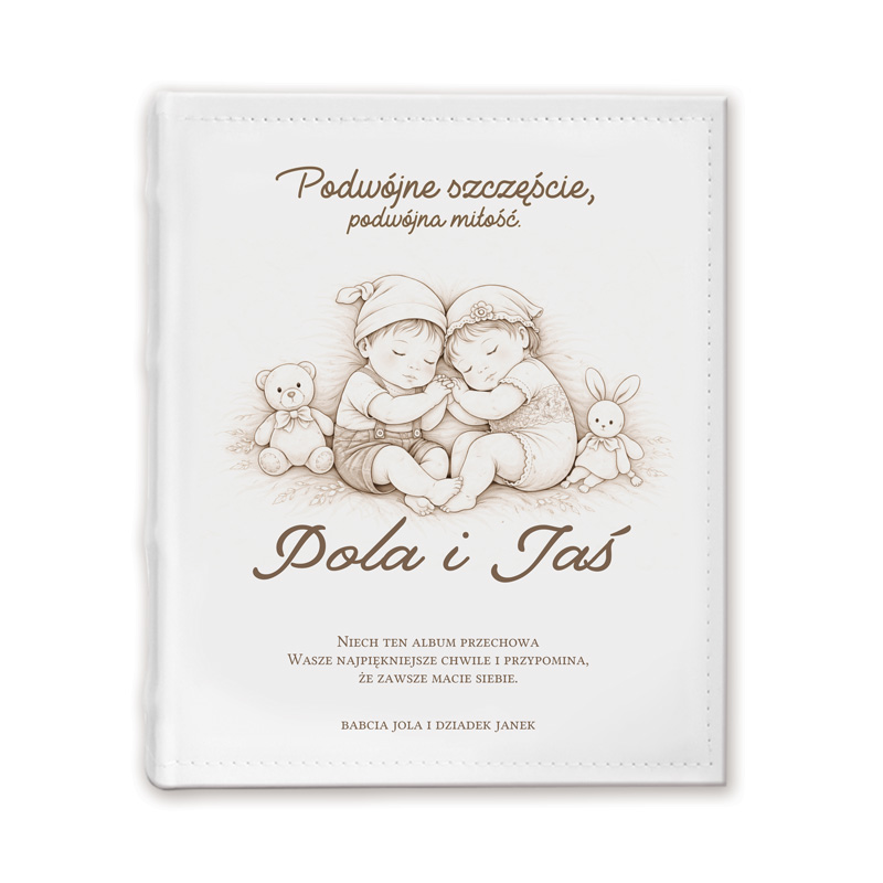 Album posiada solidną oprawę o klasycznym i eleganckim wykończeniu. Jasna, subtelna kolorystyka sprawia, że doskonale wpisuje się w charakter uroczystości takich jak narodziny, Chrzest Święty czy pierwsze urodziny. Centralnym elementem okładki jest urocza ilustracja śpiących bliźniąt – chłopca i dziewczynki. Na okładce znajduje się personalizacja z imionami dzieci oraz podpisem pod życzeniami.  Wewnątrz albumu znajdują się gładkie, grubsze karty przeznaczone do samodzielnego wklejania zdjęć. To idealne miejsce na fotografie z pierwszych dni życia, wspólnych spacerów, rodzinnych uroczystości czy codziennych, spontanicznych chwil. Każda karta została dodatkowo przedzielona półpergaminem, który chroni zdjęcia przed zarysowaniami i sklejaniem się zdjęć.