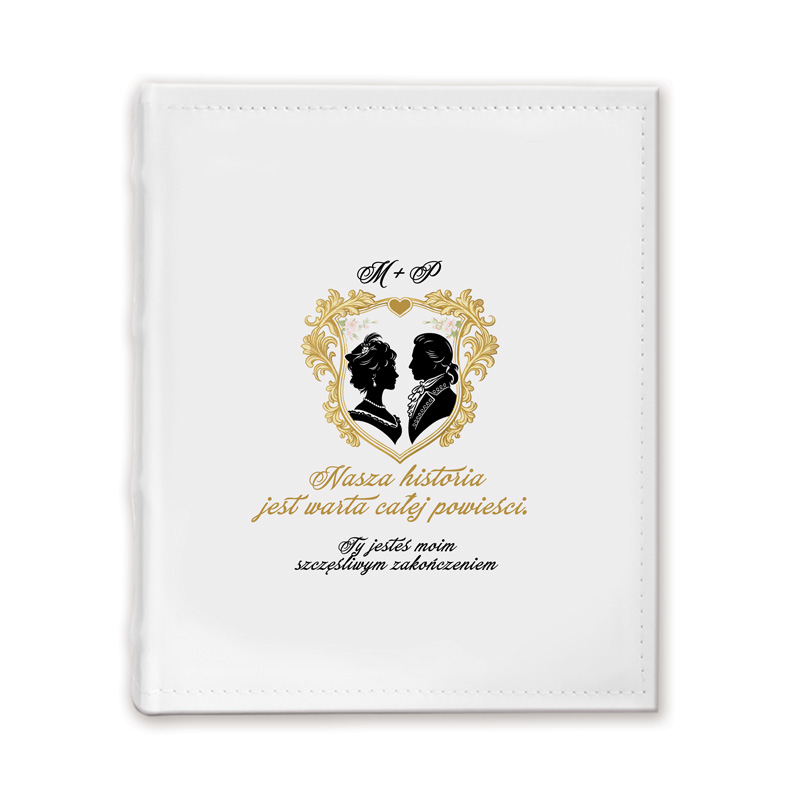 Jeśli szukasz czegoś oryginalnego, co zachwyci parę i jednocześnie nawiąże do klasyki, ten album w stylu Bridgerton będzie strzałem w dziesiątkę. Okładka przypomina elegancki herb z wizerunkami kobiety i mężczyzny, otoczonymi złotą ramą i kwiatami. Powyżej można umieścić personalizowane inicjały. Dodatkowo napis „Nasza historia jest warta całej powieści” sprawia, że całość wygląda jak pamiątka z innego czasu. Co ważne, styl graficzny został dobrany z myślą o fanach serialu, dlatego dobrze oddaje ducha epoki. Dzięki temu prezent dla fanów Bridgerton staje się nie tylko estetyczny, ale też wyjątkowo symboliczny.