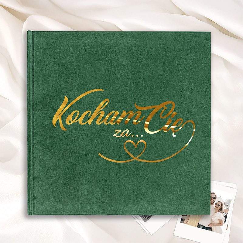 Album wykonany jest z wysokiej jakości weluru w kolorach do wyboru. Na okładce widnieje złoty napis „Kocham Cię za…” wykonany z dokładnością, który nadaje całości subtelnego blasku. Delikatne serduszko uzupełnia kompozycję, dodając jej lekkości i romantycznego akcentu. Strony wewnętrzne albumu są grubsze, białe i przełożone półpergaminem – idealnie nadają się zarówno do wklejania zdjęć, jak i do ręcznego wpisywania dedykacji, wspomnień czy wyrazów uczuć. Produkt ma praktyczny format, dzięki czemu jest wygodny w użytkowaniu i przechowywaniu.