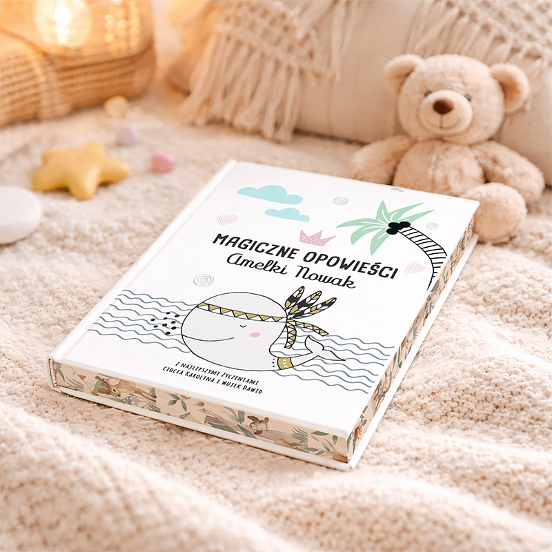 Szata graficzna książki przyciąga uwagę. Ilustracje w pastelowych kolorach, zabawny wieloryb w opasce i motywy roślinne tworzą przyjazny klimat, który idealnie wpisuje się w dziecięcy świat. Twarda oprawa sprawia, że książka nie wygina się, dzięki czemu może służyć przez długi czas. To doskonały personalizowany prezent dla dziewczynki, który pasuje na wiele okazji. Świetnie sprawdza się na urodziny, Dzień Dziecka czy święta. Rodzice, dziadkowie i chrzestni coraz częściej wybierają takie rozwiązania, ponieważ łączą one wartość estetyczną z emocjonalnym przesłaniem. Dziecko otrzymuje coś stworzonego specjalnie dla niego, to buduje poczucie wyjątkowości. Bajki stają się częścią wieczornego spokoju, wspólnych rozmów i tworzenia ciepłej atmosfery.