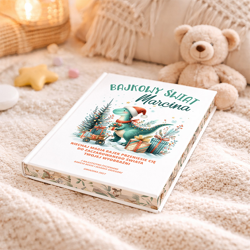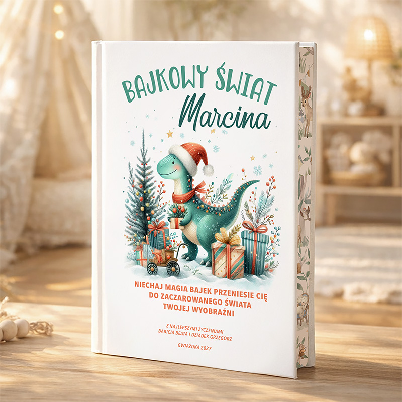 Szukasz wyjątkowego prezentu na święta, który zachwyci Twoje dziecko i przeniesie je w magiczny świat opowieści? Personalizowane bajki dla dzieci to idealne rozwiązanie, które łączy w sobie radość czytania i unikalność personalizacji. Książka z imieniem dziecka na okładce oraz dedykacją sprawi, że każda opowieść stanie się wyjątkowa. Książka „Bajkowy Świat Marcina” to personalizowana publikacja, która przenosi małego czytelnika w bajkowy świat. Na okładce widnieje sympatyczny dinozaur w mikołajowej czapce, otoczony piękną zimową scenerią. W centralnym miejscu znajduje się imię dziecka, co sprawia, że książka nabiera osobistego charakteru. Możliwość dodania specjalnej dedykacji czyni ją jeszcze bardziej wyjątkową. Wewnątrz książki znajdują się starannie dobrane bajki dla dzieci, które uczą, bawią i rozwijają wyobraźnię. Historie zostały napisane w prosty i przystępny sposób, dostosowany do najmłodszych. Wesołe, kolorowe ilustracje wprowadzają w klimat świąt, zachęcając malucha do odkrywania kolejnych stron. Solidna oprawa i wysokiej jakości papier sprawiają, że książka doskonale sprawdzi się podczas codziennego czytania i pozostanie pamiątką na lata.