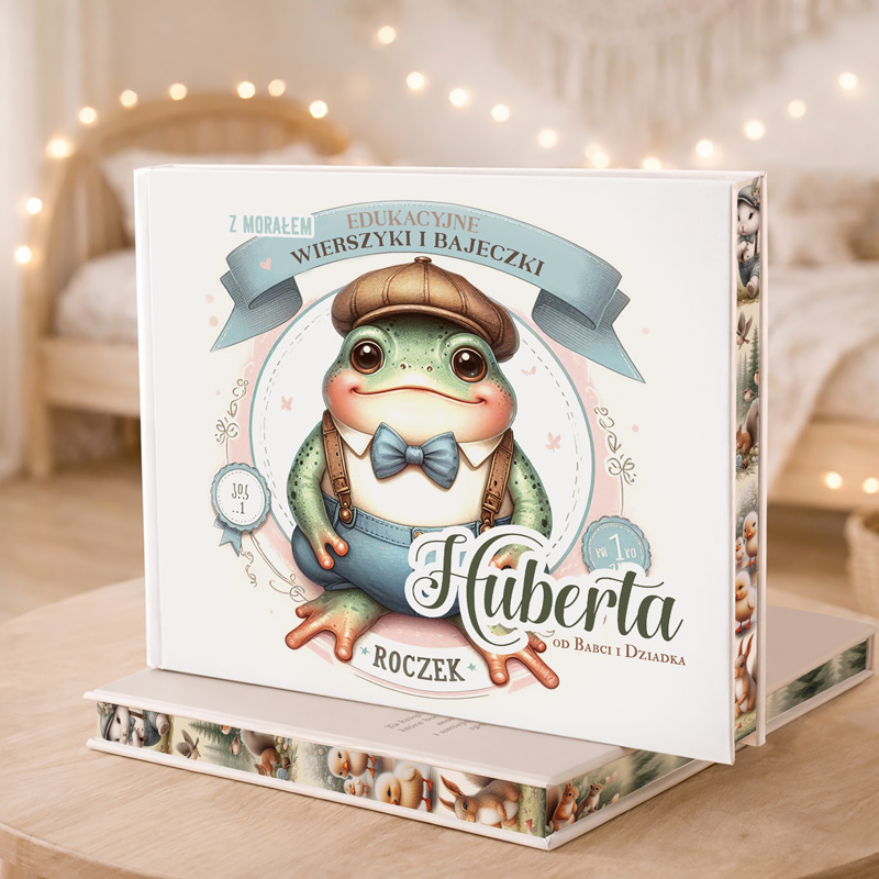 Pierwsze urodziny to wyjątkowy moment, który zasługuje na równie niezwykły prezent. Bajki z wierszykami na roczek to książka, która łączy w sobie edukacyjną wartość i piękno literatury dziecięcej. Idealnie nadaje się jako pamiątka, która zostanie z maluszkiem na długie lata. Personalizowana książka to nie tylko prezent, ale także wspaniała okazja do wspólnego czytania i budowania więzi z dzieckiem. Bajki z wierszykami na pierwsze urodzinki zaprojektowana z myślą o najmłodszych. Dzięki twardej oprawie książki pozostanie pamiątką na wiele lat, a także wyróżnia się pastelowymi kolorami oraz delikatnymi grafikami przyciągając wzrok i wprowadzają w bajkowy świat. Na okładce znajduje się personalizowany napis, zawierający imię dziecka i dedykację. Centralnym punktem ilustracji jest sympatyczna postać żaby w eleganckim stroju, która podkreśla radosny i lekki charakter książki. Dodatkowo, wewnątrz znajdziemy zestaw krótkich bajek i wierszyków z morałem, które nie tylko bawią, ale również uczą. Teksty są napisane prostym, rytmicznym językiem, idealnym dla maluchów, które dopiero zaczynają swoją przygodę z książkami. Każda strona jest wzbogacona kolorowymi ilustracjami, które zachęcają dziecko do odkrywania kolejnych opowieści. Książka posiada pięknie udekorowane brzegi.