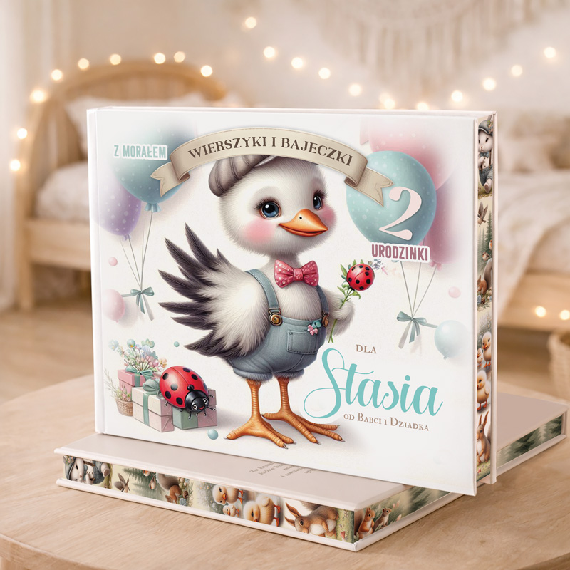 Szukasz idealnego prezentu, który zachwyci malucha i stanie się piękną pamiątką? Personalizowane Bajki z Wierszykami to wyjątkowy upominek, który łączy edukacyjne wartości, piękne ilustracje i możliwość dostosowania do potrzeb dziecka. Książka pozwala nie tylko na umieszczenie imienia dziecka, ale także personalizację wieku jubilata, dzięki czemu świetnie sprawdzi się na każde urodziny. To prezent, który rozwija wyobraźnię, uczy wartości i wprowadza w bajkowy świat pełen przygód. Ta personalizowana książka została zaprojektowana z myślą o najmłodszych. Na okładce znajduje się piękna ilustracja sympatycznego ptaszka w dziecięcym ubranku, otoczonego pastelowymi balonami, prezentami i delikatnymi dekoracjami. Personalizacja obejmuje umieszczenie imienia dziecka oraz wieku jubilata, co sprawia, że każda książka staje się wyjątkowym, indywidualnym upominkiem. Książka również zachwyca zdobionymi brzegami.