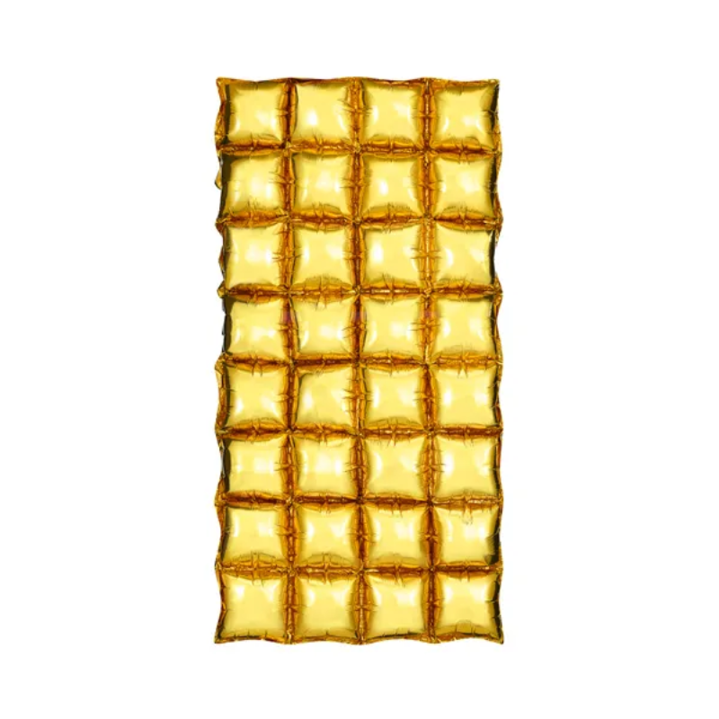 Złota dekoracja na urodziny sprawdza się jako tło do zdjęć, ozdoba ściany lub centralny punkt aranżacji sali. Balon składa się z połączonych ze sobą złotych kwadratowych modułów, które tworzą jednolitą, błyszczącą powierzchnię. Każdy moduł przypomina nadmuchaną poduszeczkę, co dodaje całości wyjątkowej formy 3D i efektownego wyglądu.