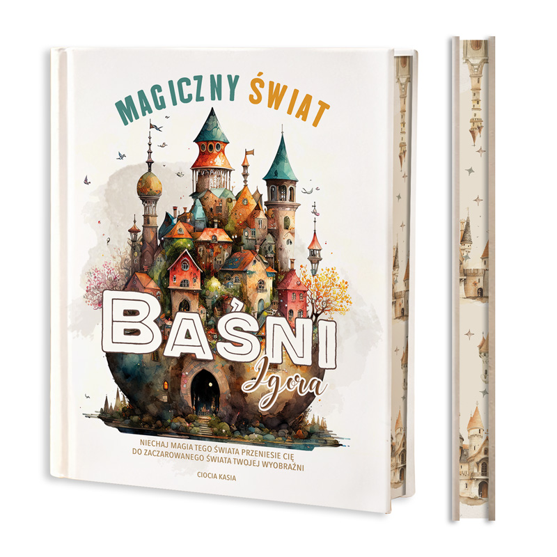 Książka z bajkami Andersena i innych autorów zawiera zbiór najsłynniejszych historii dla dzieci. Na okładce w twardej oprawie widać przepiękną ilustrację pełną kolorowych i bajkowych elementów. Misterny zamek wyłania się wśród domów i drzew. Wokół powiewają chorągwie i latają ptaki. Tytuł “Magiczny Świat Baśni” wypisany jest niebieską, żółtą i białą czcionką. Pod nim znajduje się miejsce na personalizację. Można dodać tu imię dziecka oraz podpis osoby, która przekazuje księgę baśni dziecku. Oprócz tego, widać także inspirujący cytat: