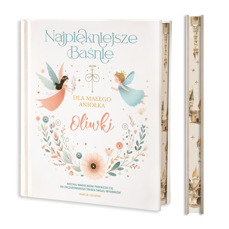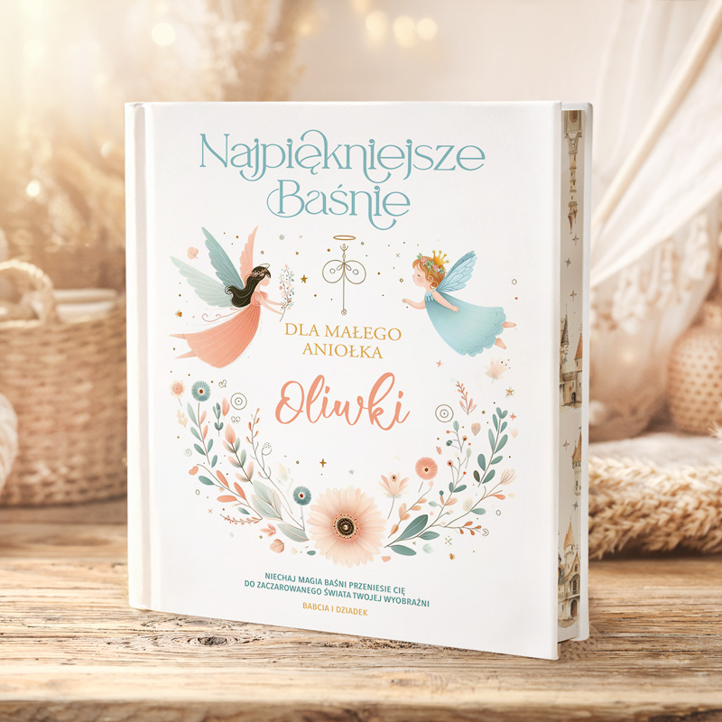 Książka „Najpiękniejsze Baśnie” przeznaczona dla małego aniołka Oliwki, zdobiona ilustracjami aniołów i kwiatami.