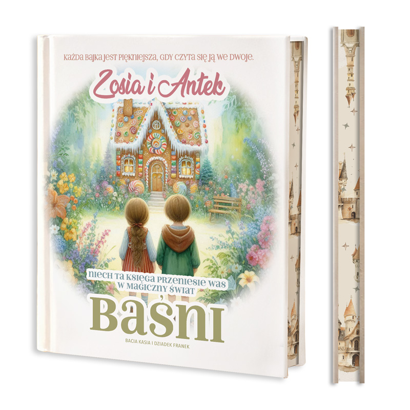 Okładka książki zachwyca bajkową ilustracją przedstawiającą rodzeństwo stojące przed magicznym, kolorowym domkiem w zaczarowanym ogrodzie. Okładka nawiązuje do znanej baśni o “Jasiu i Małgosi”. Na okładce znajdują się imiona dzieci, co sprawia, że książka nabiera osobistego charakteru. Nad ilustracją widnieje napis: „Każda bajka jest piękniejsza, gdy czyta się ją we dwoje”.  Dodatkowo na dole okładki umieszczony jest podpis osoby wręczającej prezent. Czytanie baśni to doskonały sposób na wspólne spędzanie czasu z rodzeństwem lub z rodzicami podczas wieczornego czytania. Dodatkowym atutem książki są barwione brzegi stron, które nadają jej wyjątkowego wyglądu. Ten subtelny detal sprawia, że książka wyróżnia się spośród klasycznych wydań.