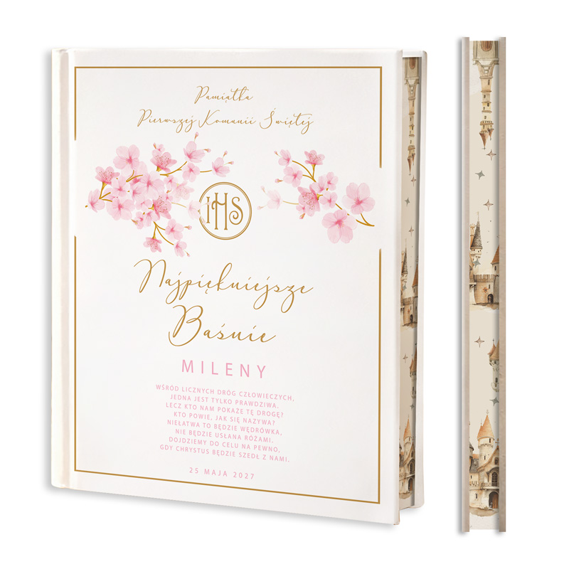 Na okładce zdobiącej tę książkę, delikatne pąki magnolii łączą się ze złotymi elementami. Góra okładki zawiera napis “Pamiątka Pierwszej Komunii Świętej” napisany czcionką przypominającą odręczne pismo. Po środku znajduje się subtelny symbol IHS, podkreślający duchowy wymiar prezentu. Pod nim znajduje się tytuł “Najpiękniejsze baśnie” oraz imię dziecka przystępującego do Komunii. Niżej widać piękne słowa przekazujące życzenia: