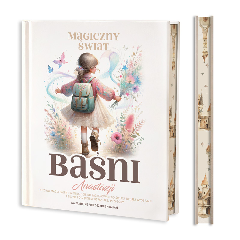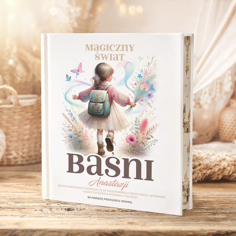 Książka z baśniami Andersena i innych autorów posiada twardą, białą okładkę ozdobioną ilustracją dziewczynki. Ma ona na sobie różową kurteczkę, białą sukienkę, a na jej plecach widać niebieski tornister. Dziewczynka beztrosko kroczy w dal, trzymając w ręku piękny, kolorowy bukiet kwiatów. Wokół niej widać rośliny i latające motylki. Grafika pełna jest pastelowych odcieni różu, błękitu i fioletu. Tytuł “Magiczny Świat Baśni” został napisany elegancką czcionką. Można spersonalizować go poprzez dodanie imienia dziecka. Tuż pod nim znajduje się dedykacja: