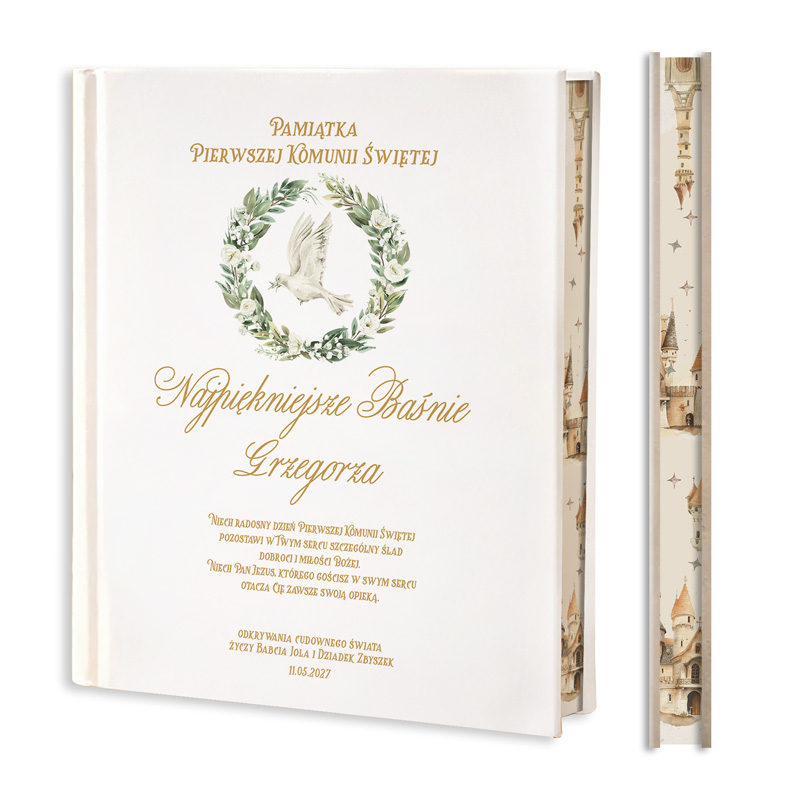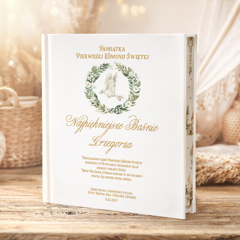 Baśnie to oryginalny i praktyczny prezent od dziadków na Komunię. Na pierwszy rzut oka książka przyciąga uwagę elegancką, białą okładką z subtelnymi motywami, przedstawiającymi wianek i gołębicę – symbole wiary i ducha. Wianek otaczający gołębicę składa się z zielonych i białych elementów. Złote zdobienia elegancko wkomponowane są w design okładki. Na samej górze widnieje tekst: “Pamiątka Pierwszej Komunii Świętej”, podkreślając personalny charakter książki. Pod grafiką widać napis “Najpiękniejsze Baśnie”, który uzupełnia imię dziecka. Pod spodem przeczytać można piękne życzenia:
