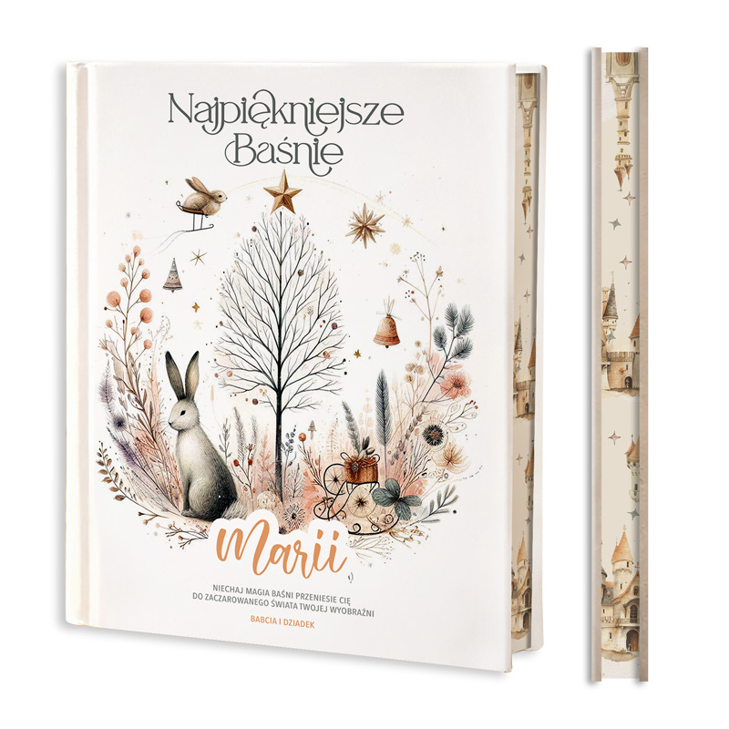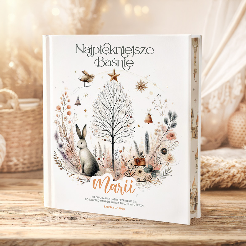 W książce znajdują się przepiękne baśnie, które przenoszą dzieci w magiczny świat opowieści. Bajeczne ilustracje wzbogacają każdą historię, czyniąc je jeszcze bardziej wyjątkowymi. Wśród opowieści można znaleźć również ponadczasowe baśnie Christiana Andersena. Okładka przyciąga uwagę delikatnym, pastelowym designem i magicznym, zimowym klimatem. W centralnej części umieszczono uroczego białego królika przy drzewku. Kompozycję dopełniają drobne kwiaty i liście w naturalnych odcieniach. Na górze okładki widnieje tytuł „Najpiękniejsze Baśnie”, zapisany ozdobną czcionką, która nadaje elegancji. Pod nim znajduje się miejsce na personalizację. Natomiast na dole okładki można umieścić podpis, co dodaje książce osobistego charakteru.