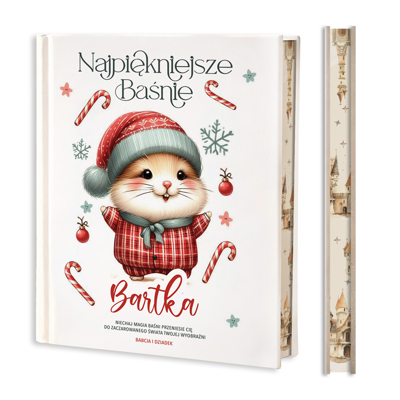 Jednym z charakterystycznych elementów tej książki jest również jej atrakcyjna szata graficzna. Ilustracje są zaprojektowane z myślą o młodych odbiorcach i oddają klimat opowieści, co dodatkowo wzbogaca doznania czytelnicze. Grafiki zachwycają swoją prostotą, a jednocześnie niezwykłą szczegółowością, która przyciąga uwagę dzieci na dłużej. Okładka książki przedstawia uroczo ubranego chomika w świątecznym klimacie. Otoczony jest wirującymi śnieżkami i kolorowymi laskami cukrowymi. Całość utrzymana jest w ciepłych, zimowych tonacjach, co nadaje jej wyjątkowy, świąteczny urok. Na górze okładki znajduje się napis „Najpiękniejsze baśnie”, który wprowadza w magiczny nastrój. Pod obrazkiem z kolei znajduje się miejsce na imię dziecka oraz osobisty podpis. Dzięki czemu książka staje się jeszcze bardziej unikalnym i personalizowanym prezentem.
