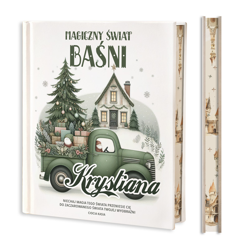 Okładka książki przyciąga wzrok zimowym, świątecznym klimatem. Centralnym elementem ilustracji jest zielona ciężarówka w stylu retro, wypełniona świątecznymi prezentami i otoczona dekoracjami. Całość utrzymana jest w pastelowych i naturalnych barwach, które podkreślają zimowy nastrój. Na górze okładki umieszczono tytuł „Magiczny Świat Baśni”, zapisany elegancką czcionką. Poniżej znajduje się miejsce na personalizację, w którym widnieje miejsce na imię. Na dole okładki umieszczony jest podpis. Ilustracja oraz personalizowane elementy tworzą wyjątkową oprawę graficzną, idealnie wpisującą się w świąteczny klimat. To pięknie zaprojektowana okładka, która zachęca do zanurzenia się w magicznych opowieściach ukrytych wewnątrz książki.