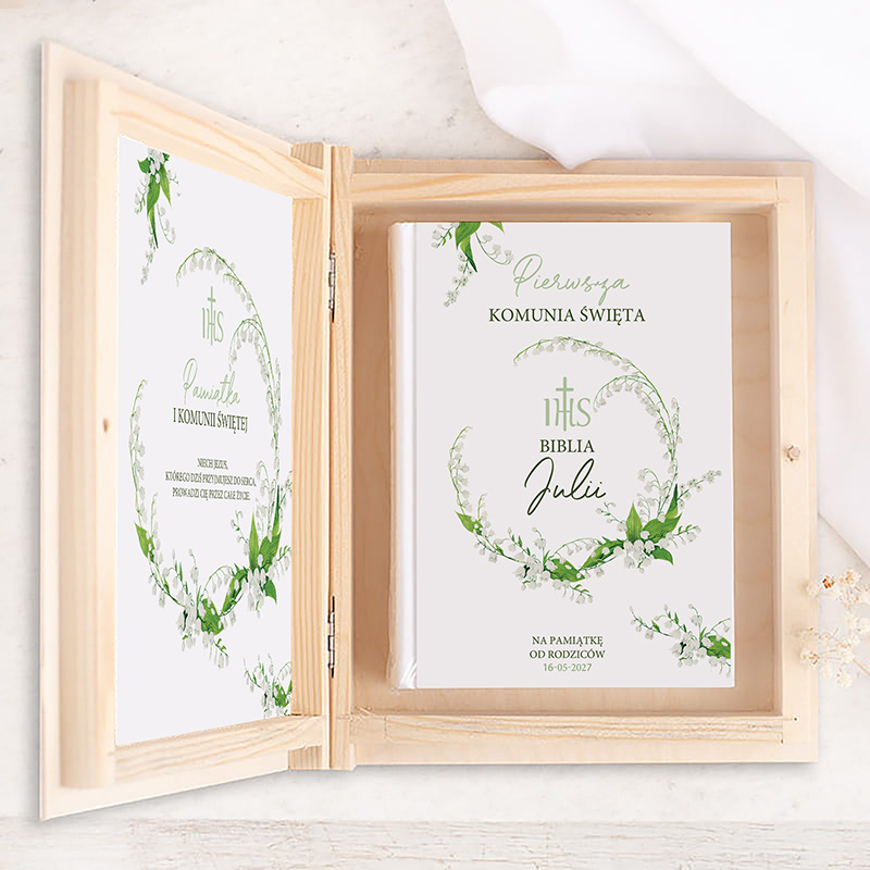 W zestawie znajduje się wydanie Biblii komunijnej umieszczone w solidnej szkatułce z jasnego, naturalnego drewna. Okładkę oraz wnętrze pudełka zdobi subtelny motyw konwalii. Personalizacja w postaci imienia dziecka, daty uroczystości oraz dedykacji sprawia, że prezent nabiera indywidualnego i niepowtarzalnego charakteru.