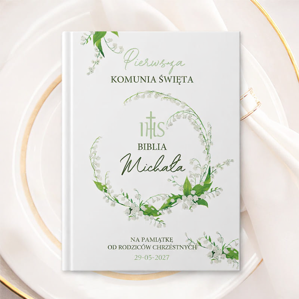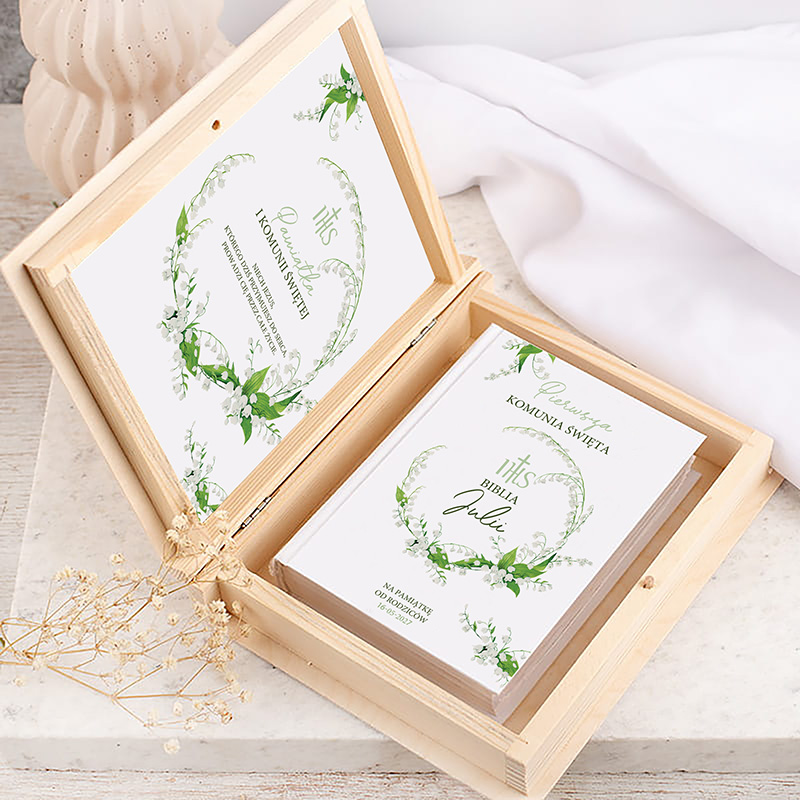 Biblia komunijna umieszczona w drewnianym pudełku z motywem konwalii to elegancki i ponadczasowy prezent na Pierwszą Komunię Świętą. Łączy w sobie duchową wartość sakramentu z estetycznym, starannie dopracowanym wykonaniem oraz możliwością personalizacji. Dzięki temu staje się nie tylko księgą religijną, ale także wyjątkowym, osobistym upominkiem wręczanym w jednym z najważniejszych dni w życiu dziecka.