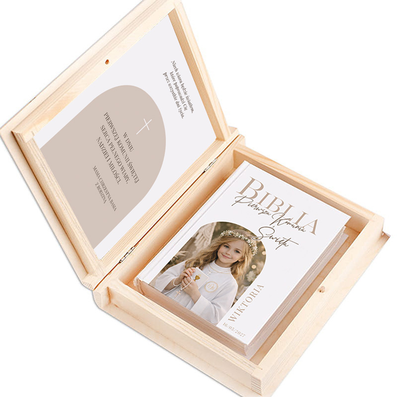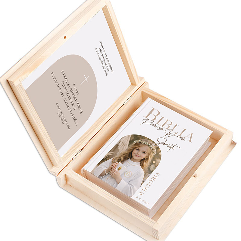 Biblia umieszczona jest w drewnianym pudełku. Wewnętrzna strona wieczka może zawiera ozdobną wklejkę z gotową dedykacją i personalizowanym podpisem. Personalizowana Biblia komunijna doskonale sprawdzi się jako prezent od rodziców chrzestnych, dziadków, rodziców lub bliskiej rodziny. Biblia komunijna ze zdjęciem na okładce w drewnianym pudełku to elegancki i personalizowany prezent na Pierwszą Komunię Świętą.
