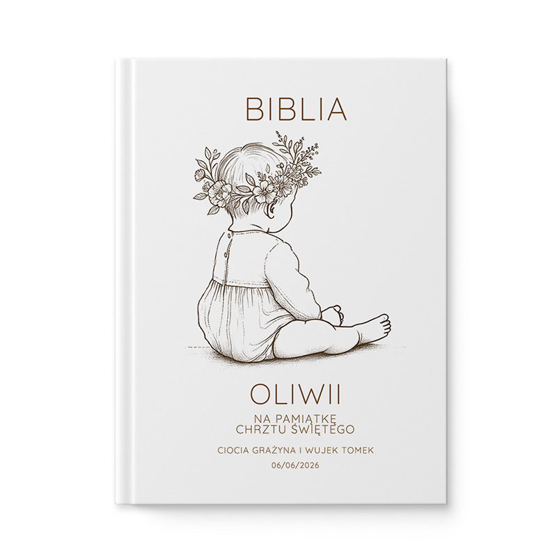 Okładka książki z rysunkiem małego dziecka siedzącego tyłem, z roślinnym wiankiem na głowie. Na górze napis 'BIBLIA', poniżej imię 'OLIWII', a dalej tekst 'NA PAMIĄTKĘ CHRZTU ŚWIĘTEGO', imiona 'CIOTKA GRAŻYNA I WUJEK TOMEK' oraz data '06/06/2026'.