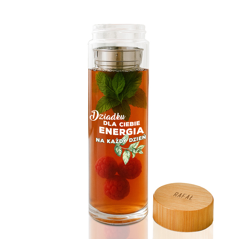 Butelka wykonana została ze szkła, odpornego na zmiany temperatury i stłuczenia. Zintegrowany metalowy zaparzacz pozwala szybko przygotować herbatę liściastą, ziołowy napar lub wodę z dodatkami. Naturalna bambusowa zakrętka nie tylko dobrze wygląda, ale również zapewnia szczelność. Personalizowane imię umieszczone na górze nadaje butelce indywidualnego charakteru. Bidon zawiera napis “Dziadku dla ciebie energia na każdy dzień” wraz z grafiką gałązki z listkami.