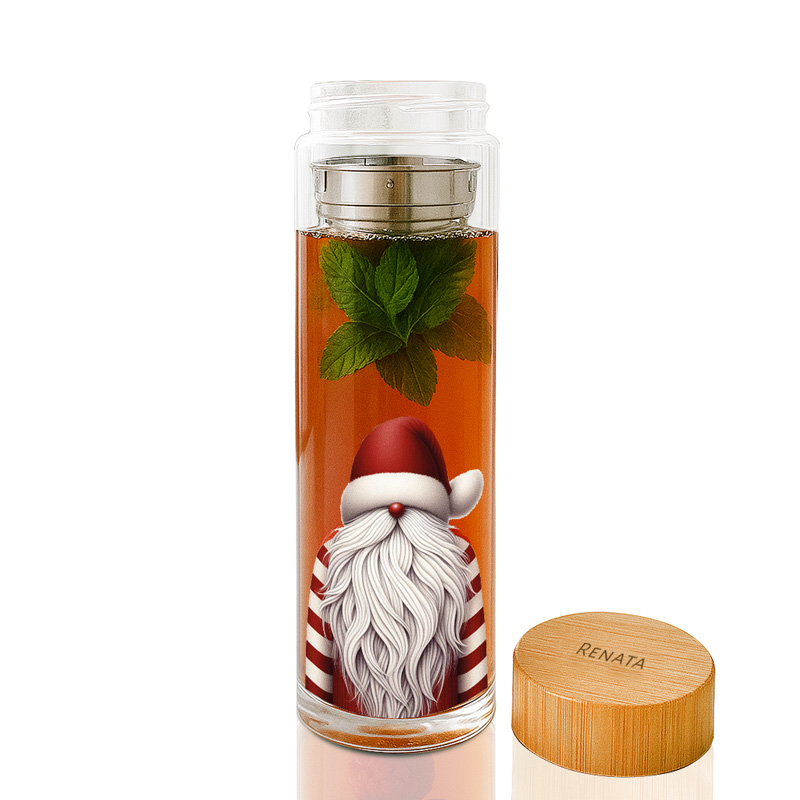 Świąteczny bidon ze szkła z podwójnymi ściankami sprawdzi się na zimowe dni. Dzięki nowoczesnej konstrukcji utrzymuje temperaturę gorących napojów nawet do 4 godzin, pozwalając cieszyć się ulubioną herbatą, ziołami czy kompozycjami zimowych naparów w każdym miejscu. Wyposażony w solidną bambusową nakrętkę oraz metalowe, wyjmowane sitko, ułatwia przygotowanie napojów bez fusów. Na froncie bidonu widnieje świąteczna grafika przedstawiająca krasnala w czapce Mikołaja. Personalizację w postaci imienia wykonamy na nakrętce.