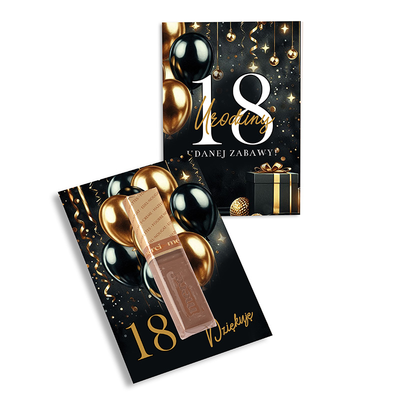 Na bileciku znajduje się duży, efektowny napis „18” oraz krótkie, ale serdeczne słowo „Dziękuję”, które w połączeniu z grafią balonów i konfetti tworzy przyjazną atmosferę uroczystości. Na odwrocie widnieją napisy ,,18 urodziny” oraz ,,Udanej zabawy”. Ponadto każda kartka została zaprojektowana z myślą o dodaniu czekoladki typu Merci. Tego typu bileciki z podziękowaniami dla gości na 18 urodziny świetnie sprawdzają się zarówno jako element dekoracyjny stołu, jak i praktyczny dodatek do prezentu wręczanego podczas imprezy. Dzięki uniwersalnemu przekazowi mogą być używane niezależnie od stylu przyjęcia – czy to impreza w lokalu, czy kameralne spotkanie w domu. Co więcej, takie rozwiązanie dodaje uroczystości osobistego charakteru i sprawia, że goście poczują się naprawdę docenieni.