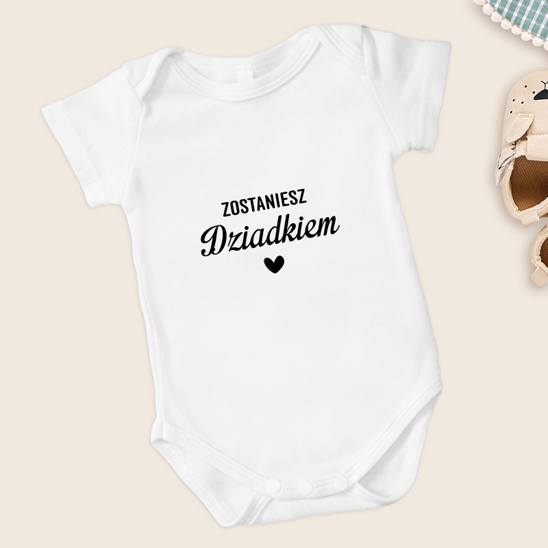 Body wykonane zostało z miękkiej bawełny w białym kolorze, a czarny napis na ubranku jest czytelny i wyraźny. Na froncie body znajduje się czarny napis w ozdobnej czcionce. W zależności od wybranej wersji widnieje tekst „Zostaniesz Babcią”, „Zostaniesz Dziadkiem” lub „Zostaniecie Dziadkami”. Poniżej napisu umieszczono małe serduszko, które podkreśla emocjonalny charakter prezentu.
