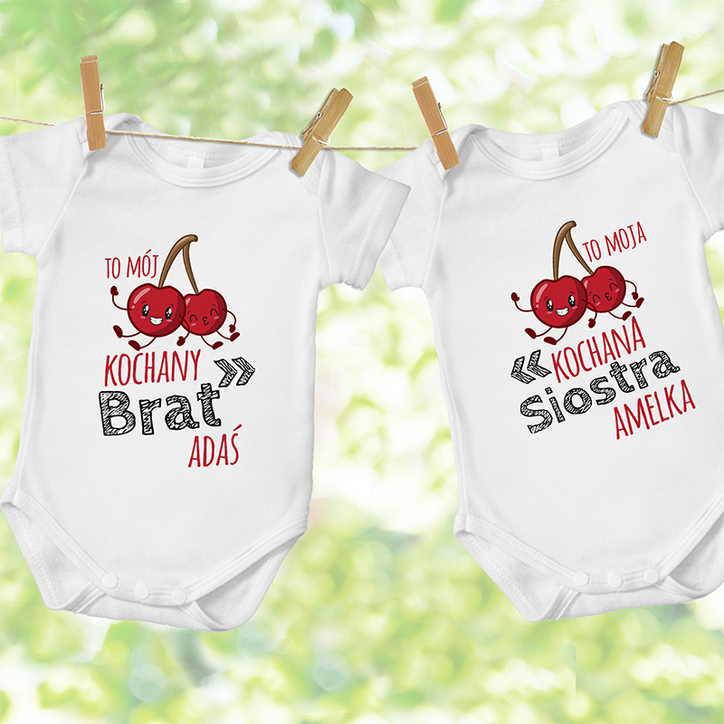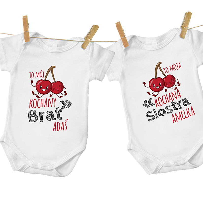 Bodziaki dla rodzeństwa dostępne na naszej stronie internetowej to ubranka wykonane z wysokiej jakości materiałów. Podczas produkcji zastosowano 100% bawełny, dzięki czemu body są wygodne i przyjemne w dotyku, zapewniając dziecku komfort w trakcie całego dnia. Do tego doskonale nadają się dla dzieci ze skórą wrażliwą, skłonną do alergii. Odzienie wykonane zostało klasycznym kolorze bieli. Całość dopełniają wzory umieszczone na przodzie w postaci napisu. Na jednym możesz zobaczyć „To mój kochany brat” wykonany w kolorze czarnym i czerwonym. Całość dopełnia wzór uroczych, uśmiechniętych wisienek. Drugi produkt analogicznie zawarty ma napis „To moja kochana siostra”. Treść, która umieścimy, możesz dowolnie konfigurować w zależności od tego, czy potrzebujesz ubranek dla pary dziewczynek, chłopców, czy siostry i brata. Produkty przygotowane zostały w różnych rozmiarach, dlatego z powodzeniem zakupisz je dla noworodków, jak i roczniaków. Niewielkie ubranka to doskonała okazja, aby zaskoczyć swoich bliskich lub podarować młodym rodzicom prezent z okazji narodzin bliźniąt.