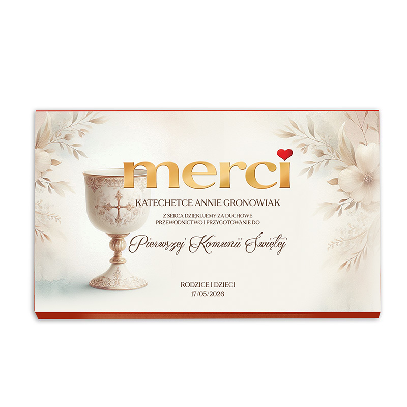 W środku znajduje się popularna bombonierka Merci z wyborem czekoladek w ośmiu smakach. To doskonały pomysł na prezent wręczany po uroczystości komunijnej – zarówno indywidualnie, jak i w imieniu całej klasy lub grupy dzieci. Personalizowana bombonierka merci to piękny i serdeczny sposób podziękowania katechetce za zaangażowanie, cierpliwość oraz prowadzenie dzieci do tego ważnego etapu ich duchowego rozwoju.
