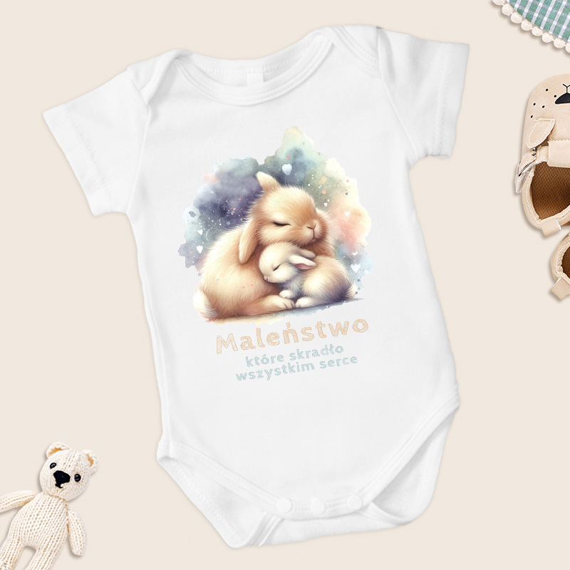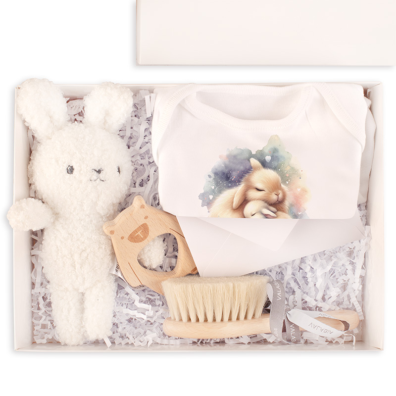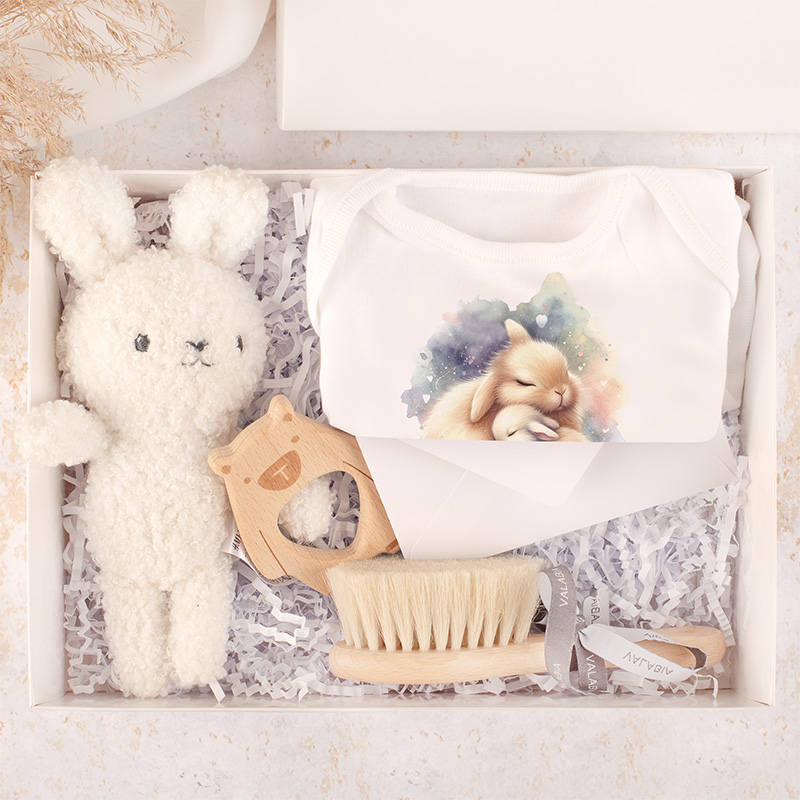 Subtelny i przemyślany box prezentowy dla niemowlaka, który zachwyca już od pierwszego spojrzenia. Całość utrzymana jest w jasnej, naturalnej tonacji z uroczymi akcentami w stylu dziecięcej ilustracji. W środku znajduje się mięciutki pluszowy króliczek – idealny do tulenia od pierwszych dni życia. Obok białe body z akwarelowym nadrukiem przytulających się króliczków i napisem „Maleństwo, które skradło wszystkim serce”. To drobny, ale czuły akcent, który wywołuje wzruszenie i uśmiech.