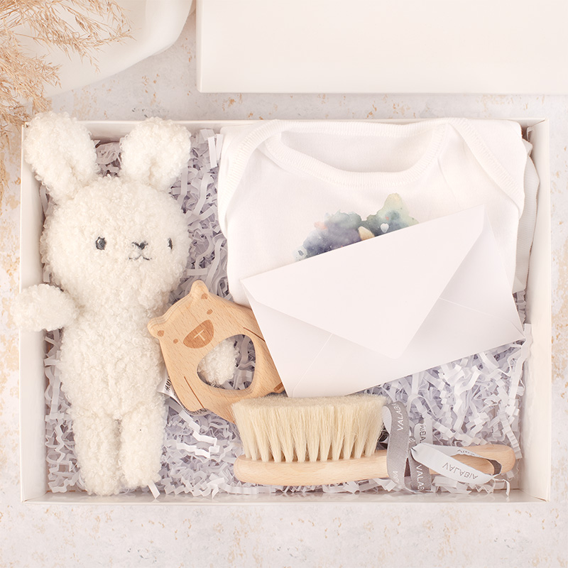 Delikatny i wzruszający prezent dla maluszka, który łączy funkcjonalność z piękną oprawą. Box prezentowy z pluszakiem, body, gryzakiem i szczotką to doskonały wybór na narodziny lub baby shower.