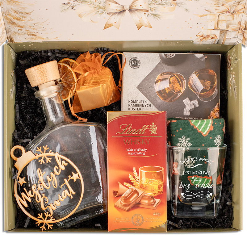 W skład zestawu wchodzi szklana karafka o eleganckim kształcie, zamykana drewnianym korkiem. Karafka świetnie nadaje się do przechowywania whisky, burbona lub innych trunków. Jej klasyczny design sprawia, że będzie ozdobą każdego barku lub świątecznego stołu. Zestaw zawiera także komplet 9 kamiennych kostek chłodzących do whisky. Dzięki nim napój można schłodzić bez rozcieńczania. Kostki wykonane są z kamienia, bezpiecznego w kontakcie z żywnością. W zestawie znalazł się również szklanka z napisem: „Życie bez whisky jest możliwe, ale bez sensu”. To zabawny, ale i stylowy akcent. Szklanka idealnie leży w dłoni i pasuje do każdego rodzaju whisky. W boxie nie mogło zabraknąć także słodkiego akcentu – czekolady z nadzieniem o smaku whisky oraz klasycznych czekoladek zapakowanych w woreczek z organzy. Dopełnieniem zestawu są świąteczne skarpety oraz ozdobna zawieszka drewniana z napisem “Wesołych Świąt”.