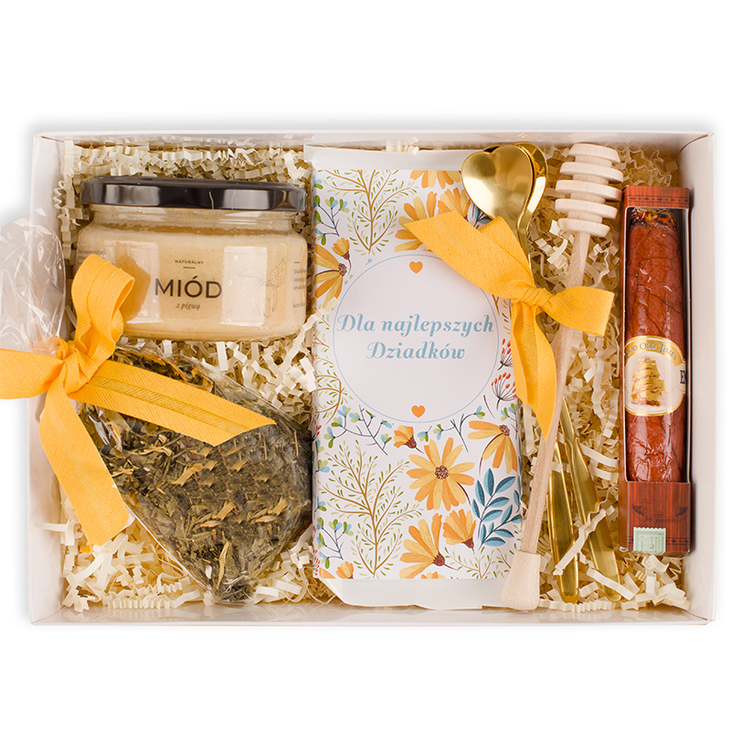 Box jest idealny, gdy chcesz wręczyć prezent, który będzie uniwersalny, a jednocześnie piękny i pełen znaczenia. Sprawdza się w każdej sytuacji, w której liczy się serdeczny gest: na Dzień Babci i Dzień Dziadka, urodziny, imieniny, święta, rocznicę, a także jako klasyczne podziękowanie za opiekę, wsparcie i wszystkie te drobne rzeczy, które dziadkowie robią dla rodziny każdego dnia. To także świetny wybór dla osób, które chcą dać prezent wspólny – jeden, ale dopasowany do dwojga, w eleganckim wydaniu. Dlaczego to dobry upominek? Bo jest praktyczny i jednocześnie sprawia przyjemność. Miód i herbata realnie się przydadzą, słodkości umilą dzień, a złote łyżeczki i czerpak zostaną na długo jako stylowy dodatek w kuchni. Ten zestaw prezentowy dla dziadków to przemyślany box.