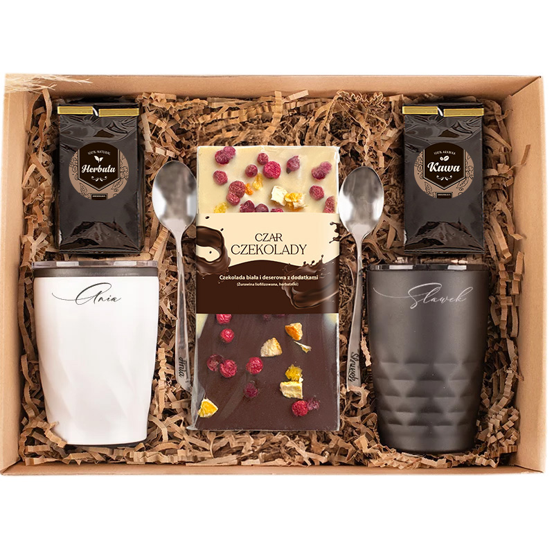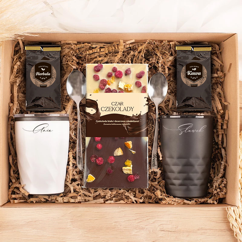 Zestaw prezentowy dla pary w efektownym pudełku w kraftowym stylu. Dwa kubeczki termiczne w kolorze czarnym i białym są podpisane imionami małżonków. Dwie grawerowane łyżeczki przydadzą się do napojów przygotowywanych w domowym zaciszu. Dwa opakowania z kawą i herbatą pozwolą delektować się ulubionym gorącym napojem. Luksusowa czekolada z liofilizowaną żurawiną i herbatniki. Osłodzą wspólne chwile. Ekologiczne wypełnienie pozwala utrzymać zawartość w odpowiednim porządku.