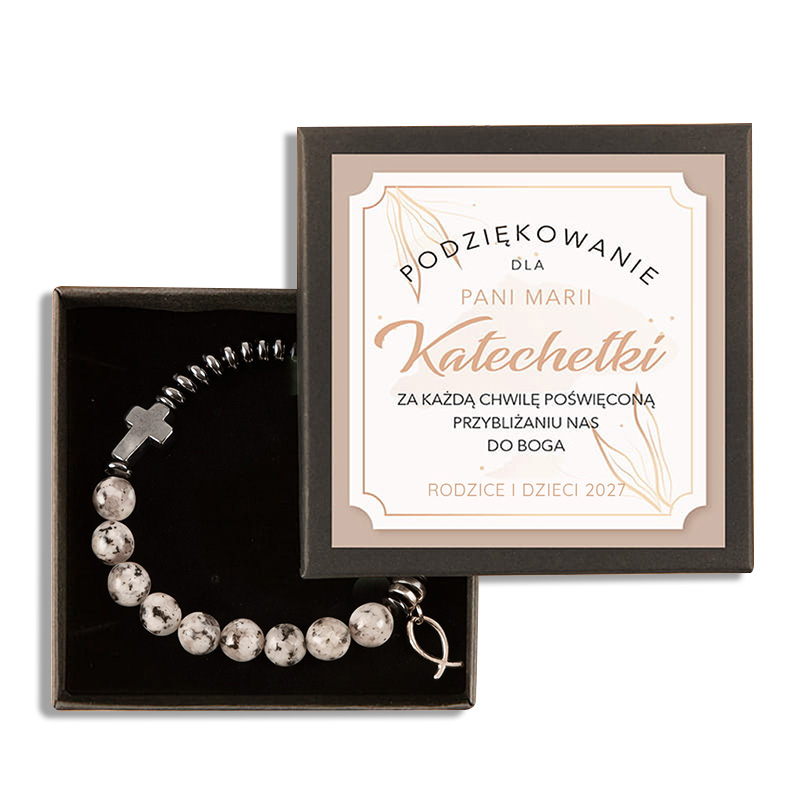 Bransoletka damska “Podziękowanie dla Katechetki” to wyjątkowy produkt, który wyrazi wdzięczność osobom pełniącym tę szczególną rolę. Wykonany z najwyższej jakości materiałów, łączy w sobie elegancję i klasykę, dzięki czemu stanowi idealny prezent na zakończenie roku szkolnego, Komunię Świętą czy uroczystości związane z katechezą. Dzięki swojemu uniwersalnemu designowi, bransoletka pasuje do wielu stylizacji, co czyni ją praktycznym i stylowym dodatkiem na każdą okazję.