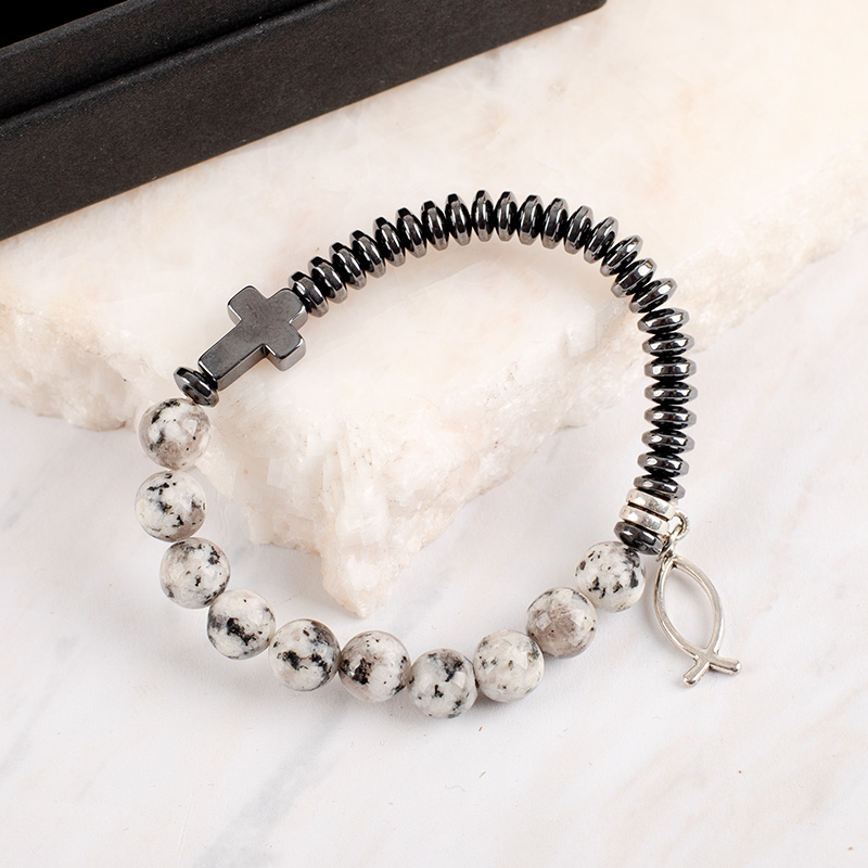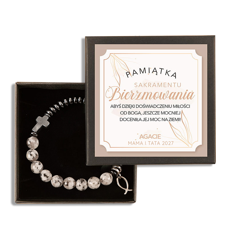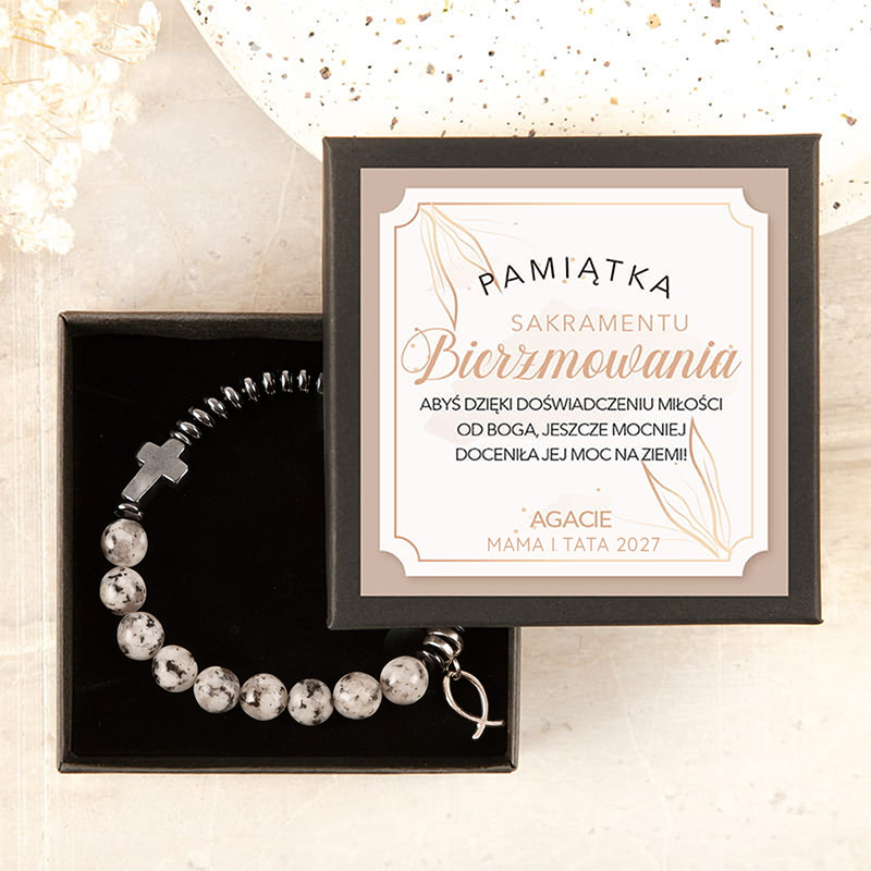 Bransoletka na bierzmowanie to prezent, który wnosi nowy wymiar do tego dnia. Wykonana z dbałością o szczegóły, symbolizuje zarówno duchową dojrzałość, jak i stabilność, które towarzyszą temu sakramentowi. Dostępna jest w dwóch wersjach do wyboru, dzięki czemu każdy znajdzie coś pasującego dla osoby obdarowywanej. W jednej wykorzystany został jaspis dalmatyński i hematyt, druga wykonana została z drewna, ozdobiona koralikami o bogatym brązowym odcieniu. Oba modele zawierają delikatnie osadzony krzyżyk, przypominający o głębi i znaczeniu tego sakramentu. Biżuteria zapakowana jest w czarne ozdobne pudełko z dedykowaną wklejką zawierającą imię dziecka, podpis oraz datę. Taki szczegół sprawia, że jest to niezwykle osobisty podarunek. Dodatkowo, na wklejce znajdują się życzenia: