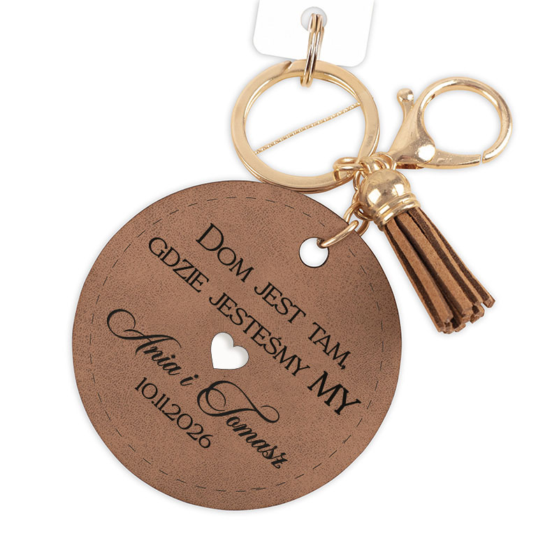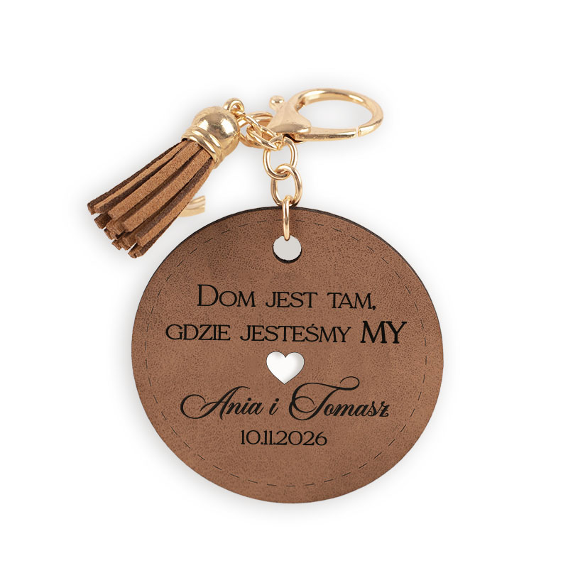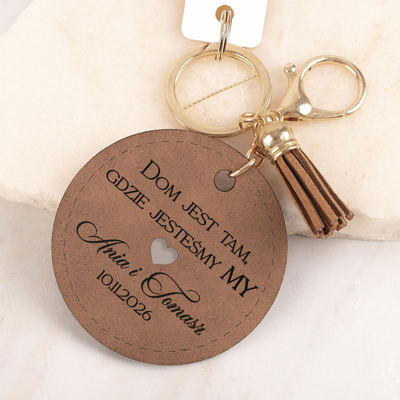 Okrągły brelok skórzany to stylowy dodatek do kluczy, który doskonale sprawdzi się jako prezent dla osób rozpoczynających nowy rozdział w swoim życiu. Na breloku znajduje się dekoracyjny napis: “Dom jest tam gdzie jesteśmy my”. Personalizacji podlegają imiona oraz data. Brelok wyposażony jest w solidne metalowe kółko oraz ozdobny chwost, który nadaje mu stylowego charakteru. Dzięki uniwersalnemu designowi doskonale pasuje zarówno do kluczy od domu, mieszkania, jak i samochodu.