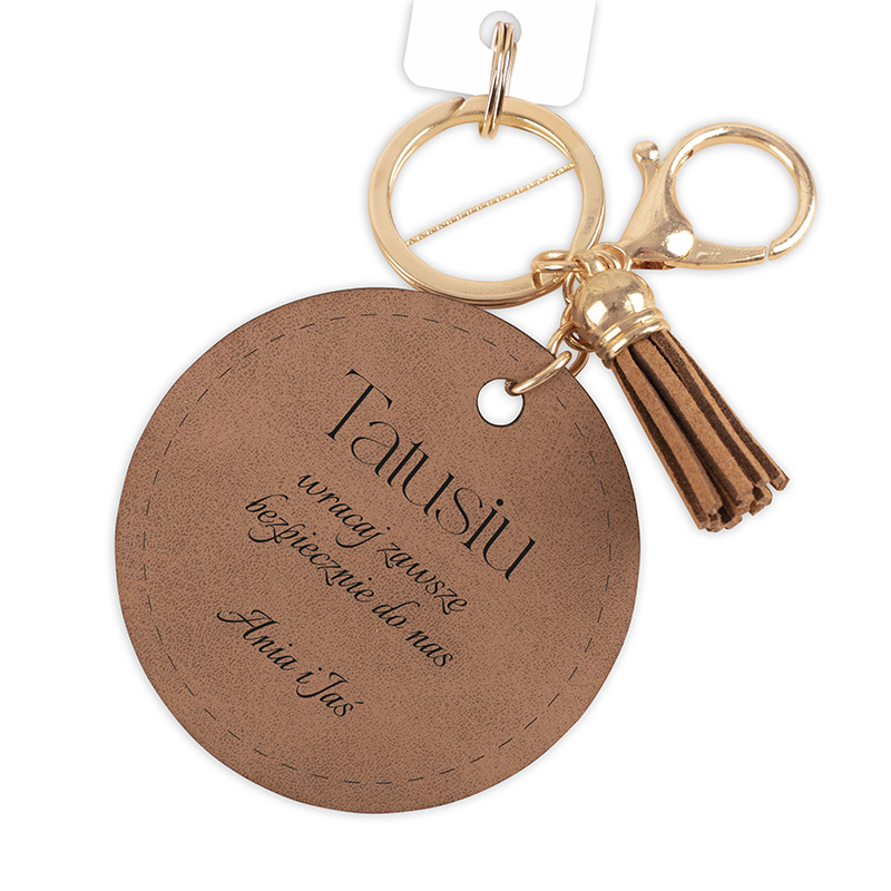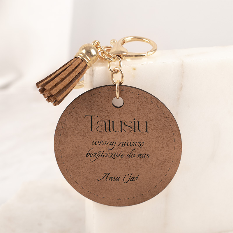Skórzany brelok jest okrągły w pięknym kolorze z metalowymi dodatkami w kolorze złota. Do breloka przymocowany jest praktyczny karabińczyk oraz elegancki chwost ozdobny. Brelok jest grawerowany, widnieje na nim napis „Tatusiu, wracaj zawsze bezpiecznie do nas” i popis poniżej. Brelok pasuje zarówno do kluczy samochodowych, jak i domowych, można go też przypiąć do torby czy plecaka. To niewielki, ale wyrazisty dodatek, który za każdym razem wywoła uśmiech i rozczulenie.