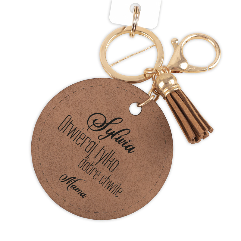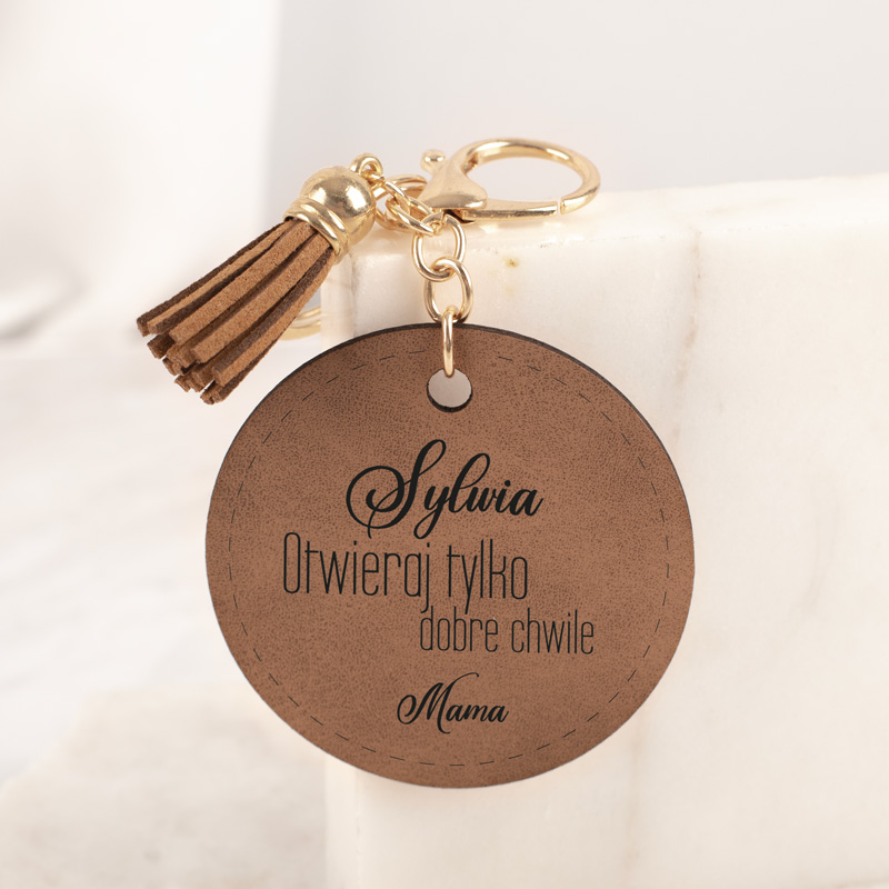 Skórzany brelok w ciepłym, karmelowym odcieniu. Brelok ma okrągły kształt, złoty metalowy zaczep i kółeczko. Całość wieńczy ozdobny chwost, który uzupełnia całość. Na powierzchni skórzanego breloka znajduje się napis “Otwieraj tylko dobre chwile” oraz personalizowane imię osoby obdarowanej oraz podpis.