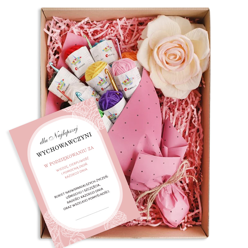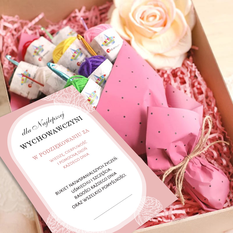 W środku znajduje się zestaw 12 kolorowych włóczek wraz z 6 szydełkami. Jest to oryginalny pomysł na prezent, który symbolizuje cierpliwość, kreatywność i misterną pracę wychowawcy włożoną w wychowanie i edukację. Całość uzupełnia duży kwiat dekoracyjny oraz elegancka kartka z podziękowaniem, na której widnieje wzruszająca dedykacja: